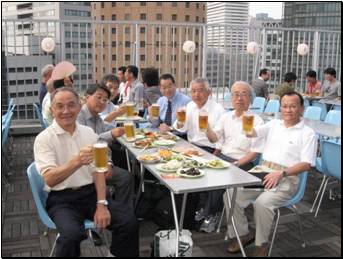 ・日時:7月21日(金)18:00〜20:30 ・場所:大阪駅前第1ビル屋上、神仙閣ビアガーデン ・出席者:7名(佐藤正昭、三ツ井強、中野能孝、山田陽三、橋本肇、西尾信之、更井敬治) |