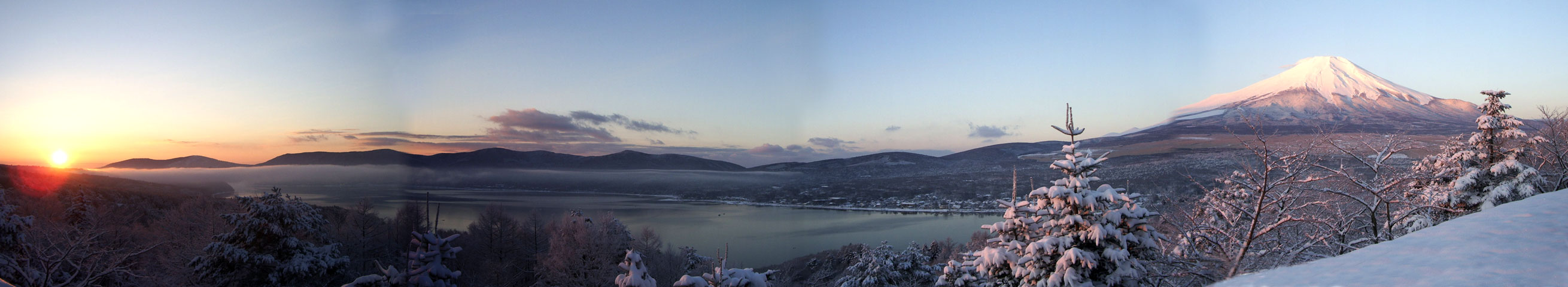 日の出と朝焼けに染まる冨士
